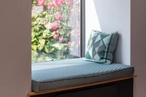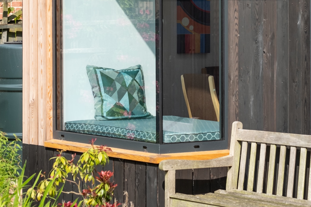 To realise the vision, BBA worked with IDSystems to specify an open-corner sliding door system utilising theEDGE2.0, that transforms the entire rear of the home. With no fixed corner post, the glazing opens completely to connect indoors with outdoors – flooding the space with light and framing uninterrupted garden views. Above the doors, a timber canopy wraps around a projecting window seat – creating a warm, natural focal point and a cosy place to read, relax, or enjoy the garden even on cooler days.
