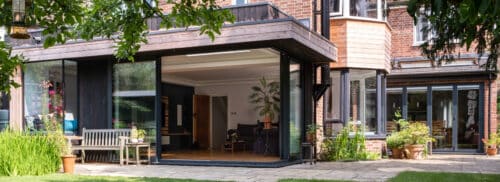 Designed by BakerBrown, the eco-annexe at Abbots Barn adds space, light and a greater connection between the house and thanks to clever design and IDSystems' sliding doors